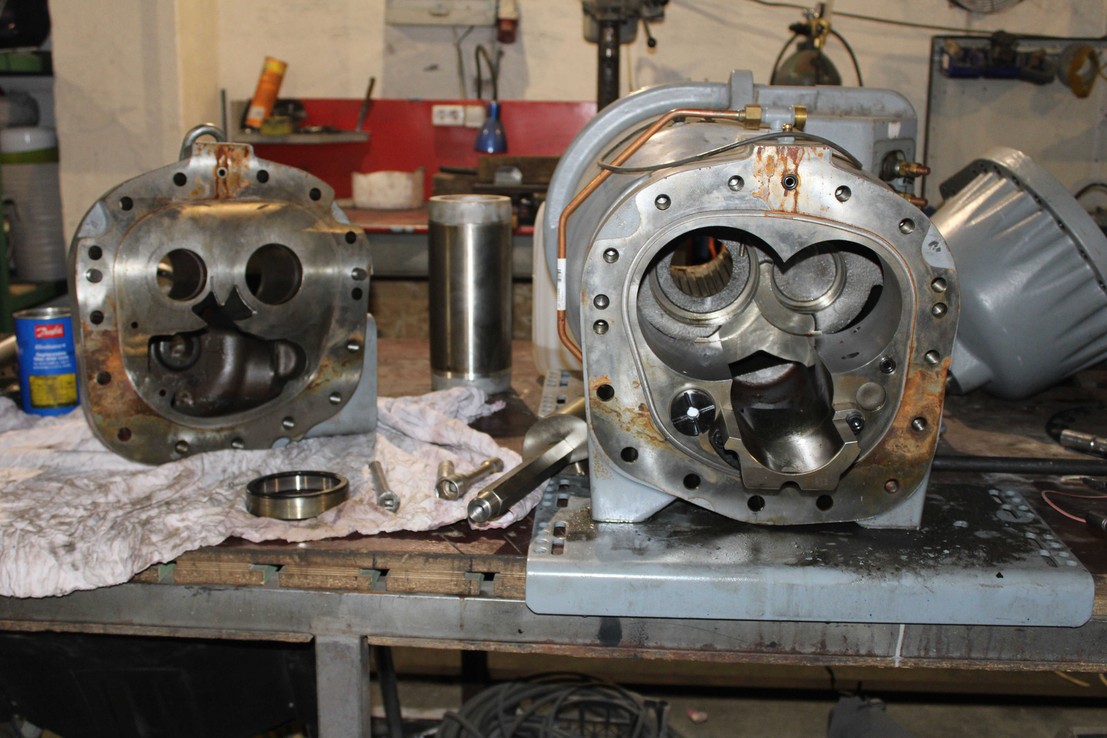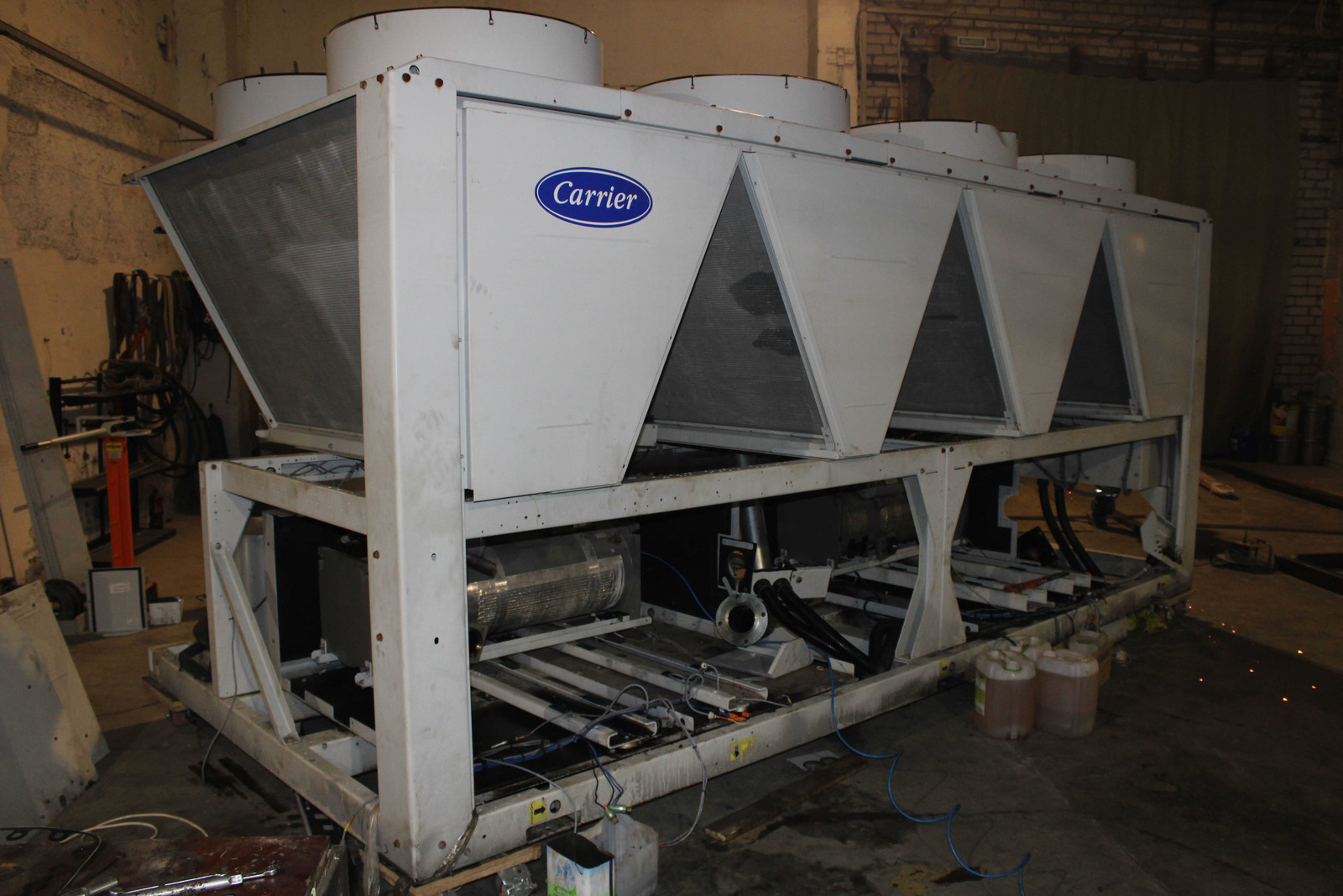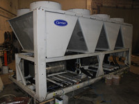 Описание: произведена диагностика чиллера с последующим ремонтом. Выявлены дефекты: присутствие воды в обоих контурах теплообменника, механические повреждения его трубок, неисправность ТРВ экономайзера контура В, коррозия всех составляющих компрессора контура В, притирание прецизионной контргайки к обойме подшипника ведущего винта в результате смещения рабочего зазора компрессора контура А, повреждения уплотнительной резинки корпуса компрессора контура А, отсутствие фильтров грубой очистки и датчиков температуры на входе и выходе испарителя. Выполнено: химическая промывка теплообменника (испарителя) чиллера; экономайзеров, маслоотделителей; капремонт испарителя и компрессоров с заменой подшипников, уплотнителей, сальников; замена ТРВ экономайзера контура В и сердечников фильтров-осушителей двух контуров; установка датчиков температуры; полная замена масла контура А и В.
